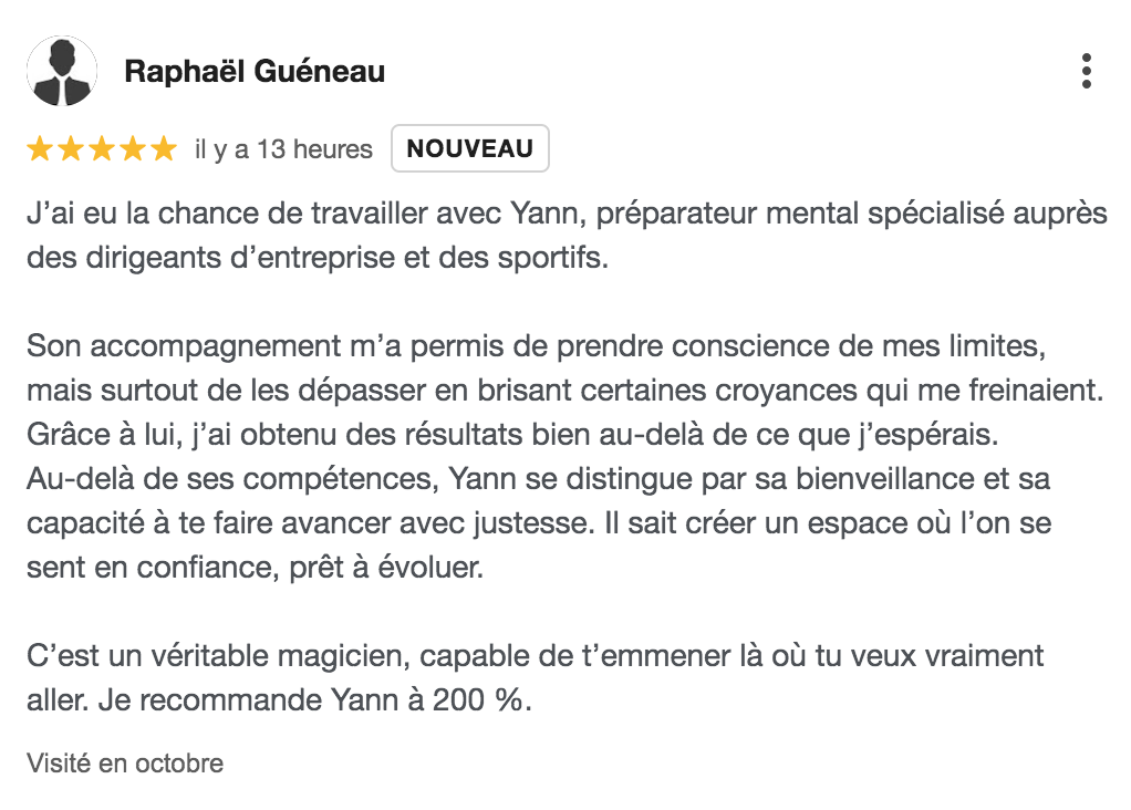 Yann Huet accompagne les entrepreneurs et les sportifs à dépasser leurs blocages, réduire leur charge mentale et développer leur potentiel grâce à de nouvelles stratégies mentales. Ensemble, retrouvons confiance, sérénité et équilibre pour atteindre vos objectifs..