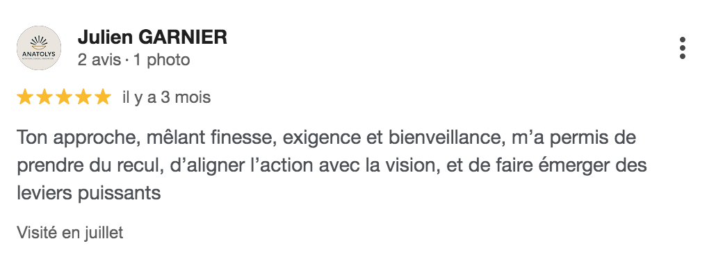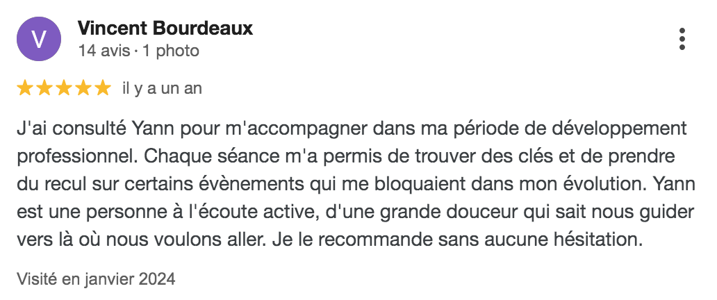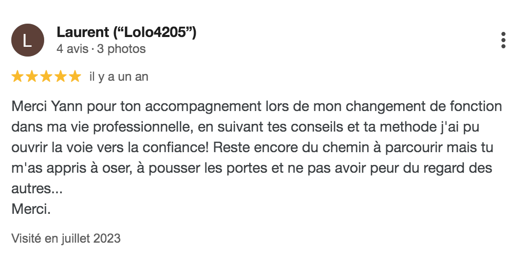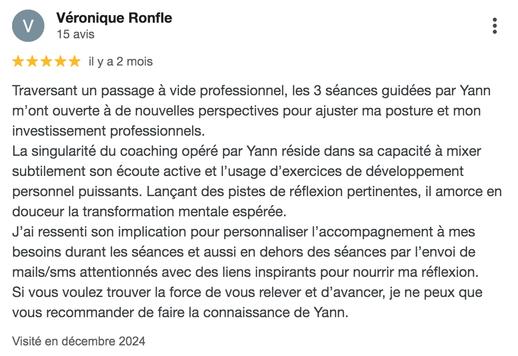 Lire la suite..."Merci Yann de m'accompagner dans mon projet. Tu es à l'écoute et tu proposes des actions ciblées et très justes. Être coachée avec une telle sincérité me permet de retrouver confiance et dynamisme. Tu me guides dans l'atteinte de mon objectif et je retrouve de la motivation et de l'envie. Merci. "