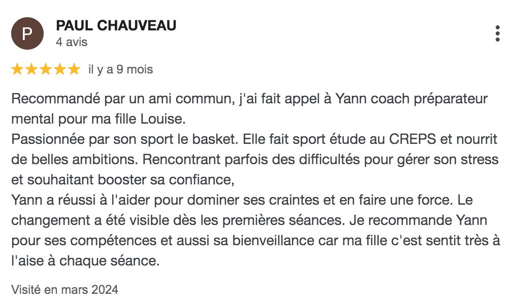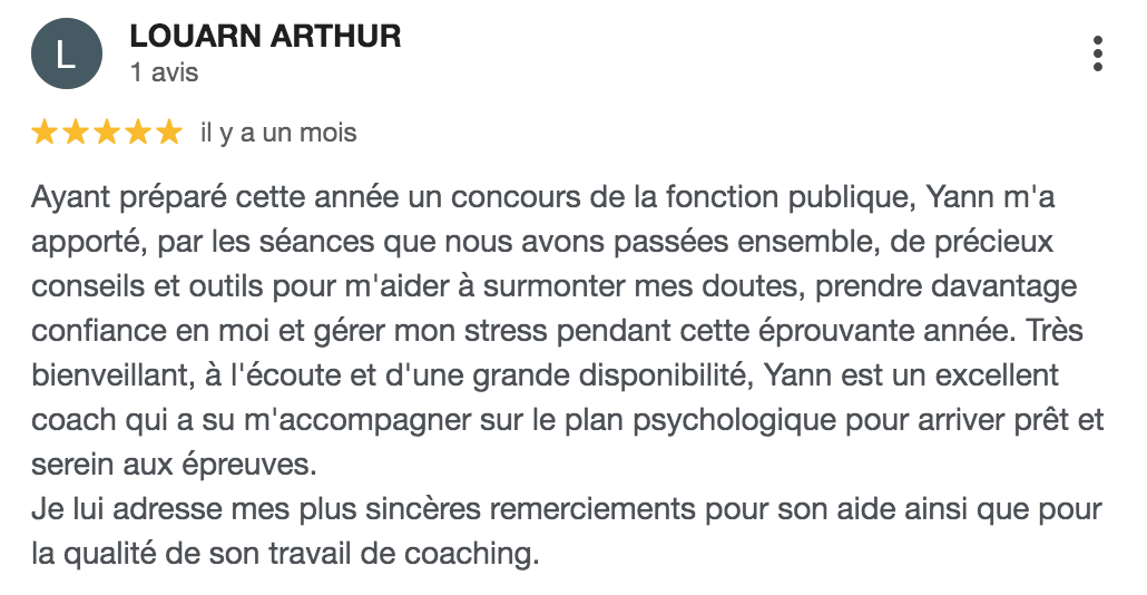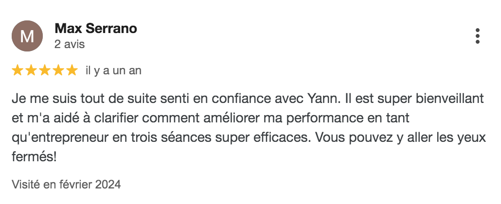 "Yann est un super coach, de bons conseils, et on se sent en pleine confiance. Je recommande totalement. Mes séances ont été bénéfiques. Je remercie encore Yann et vous le conseille vivement."