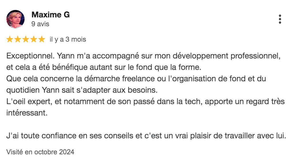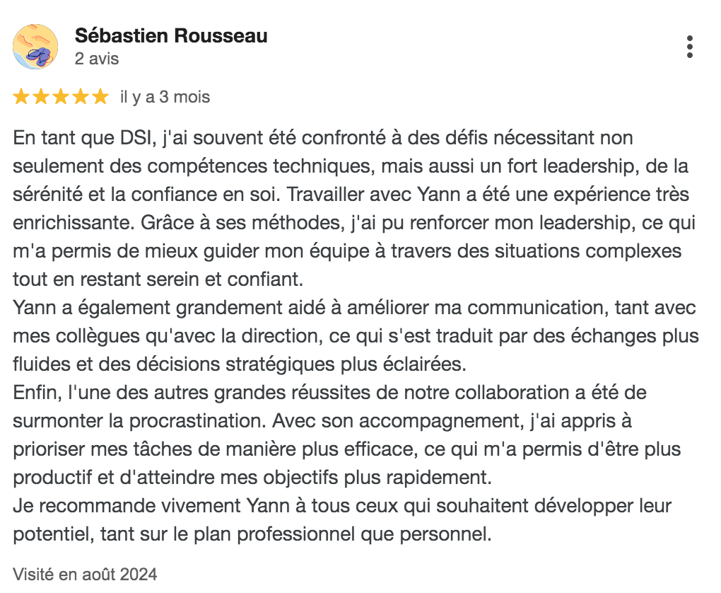 "Deux personnes de mon réseau m'avaient recommandé les services de Yann. J'avais besoin d'un coach à l'écoute, qui comprenne mon changement d'activité professionnelle, qui sache me questionner mais qui sache aussi suggérer et me partager son expérience (uniquement après avoir sollicité mon approbation). Je dois dire que j'ai trouvé tout cela chez Yann et bien plus encore. Grâce à nos séances, j'ai pu rapidement progressé sur mon chemin et ainsi gagner des mois sur ma réflexion et ma posture. Yann a su me questionner, s'étonner et me faire les bonnes suggestions pour m'aider. Encore merci pour nos échanges riches et fructueux ! Hervé D."