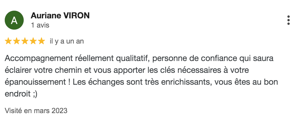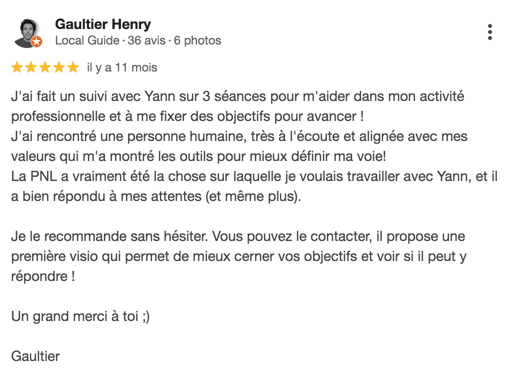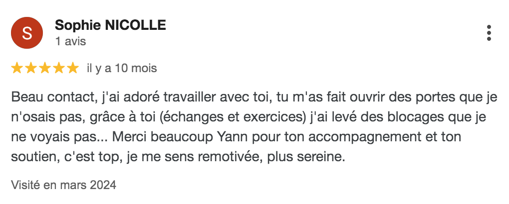Lire la suite..."Depuis des années je lisais des livres de développement personnel, ça me faisait beaucoup de bien sur le coup mais je n'avançais pas. J'étais perdue aussi bien au niveau personnel que professionnel. Sur le conseil d’une amie, j'ai suivi un accompagnement avec Yann. Je me suis tout de suite sentie en confiance, c’était important pour moi. Je le remercie vraiment pour sa bienveillance et son respect. Il m’a écouté puis m’a posé des questions très pertinentes. J’ai eu de vraies prises de conscience sur ma manière de fonctionner. J’ai pu identifier des croyances qui me limitaient et qui m’empêchaient d’avancer. Grâce à des exercices relativement simples, j’ai réussi à reprendre confiance en moi et à me projeter positivement vers un nouveau projet professionnel. Je ne connaissais pas la PNL mais j’ai été vraiment surprise des changements rapides. A chaque séance je suis ressortie apaisée et avec des clés pour avancer. TOP Aujourd’hui ma vie a changé. Merci beaucoup Yann, je recommande ton coaching à toutes les personnes qui veulent avancer dans la vie mais qui n’ont pas confiance en elles et qui ne savent pas comment faire."